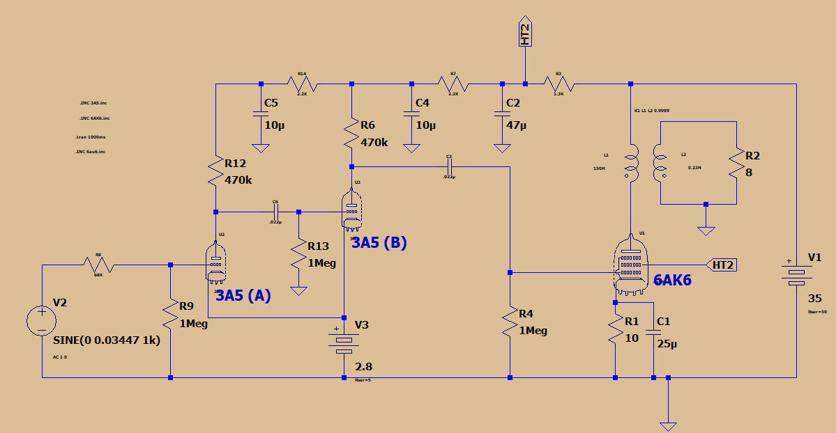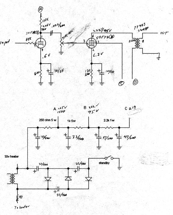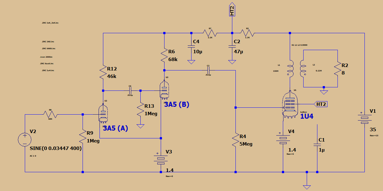 The biggest kludge of the design is my tube selection. The pre-amp tube has 1.4v heaters and the power tube has 6.3v heaters. I used separate batteries, but will eventually rig this thing to use a single heater supply and regulation, will probably reevaluate the the whole thing at that time. 6AK6 version schematic